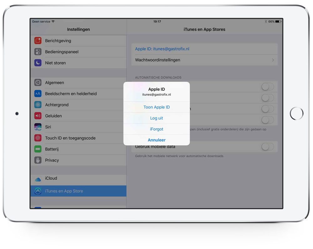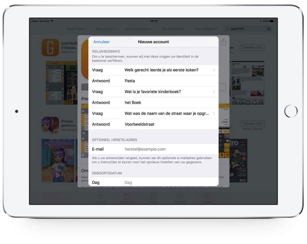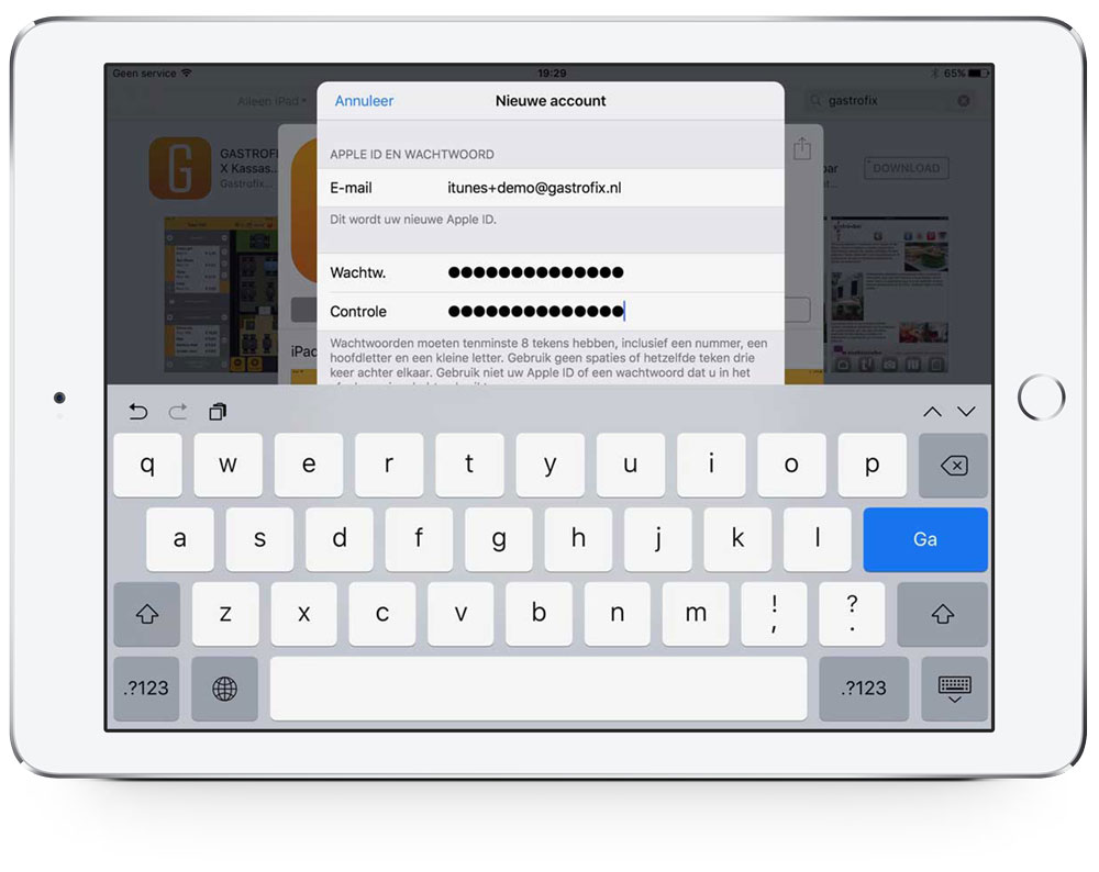 Om de GASTROFIX App uit de App-Store te downloaden heeft u een Apple ID van Apple nodig. Doorgaans stellen wij u een Apple ID ter beschikking of kunt u uw eigen Apple ID gebruiken.