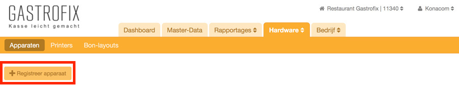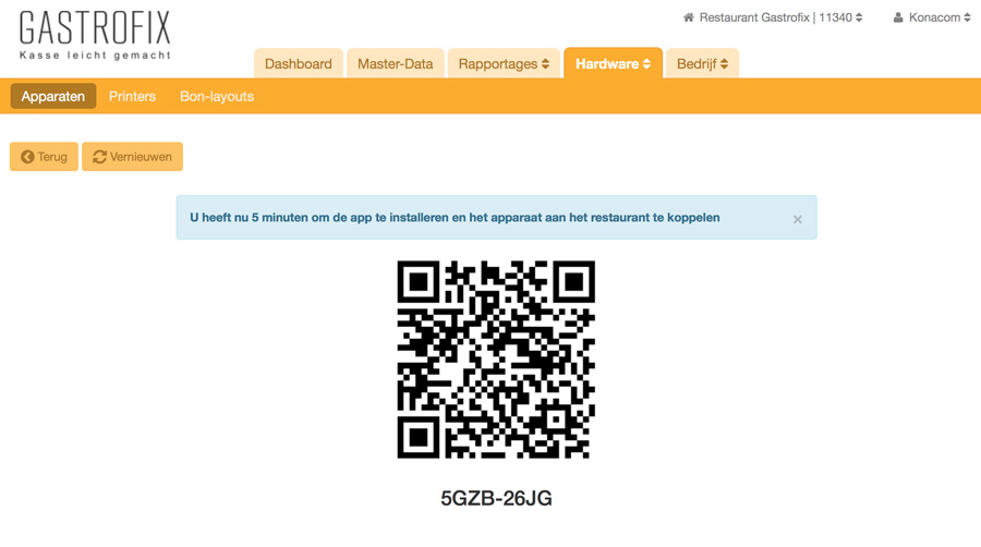 Om uw apparaat met behulp van een QR-code te registreren dient u deze eerst te genereren in uw Cloud-Backoffice. Dit kan in uw backoffice onder "Setup > Hardware". Klik hier op de button "Registreer apparaat". Er verschijnt nu een QR-code op uw scherm, welke u met de camera van uw apparaat (iPad/ iPod) kunt scannen.