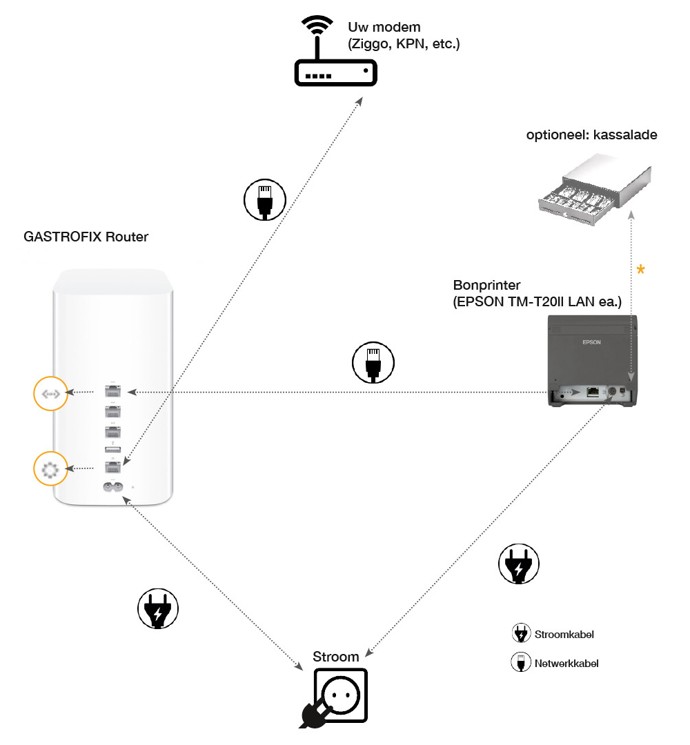 * Let op: De aansluiting van uw kassalade niet met de netwerkpoort van uw printer verbinden!