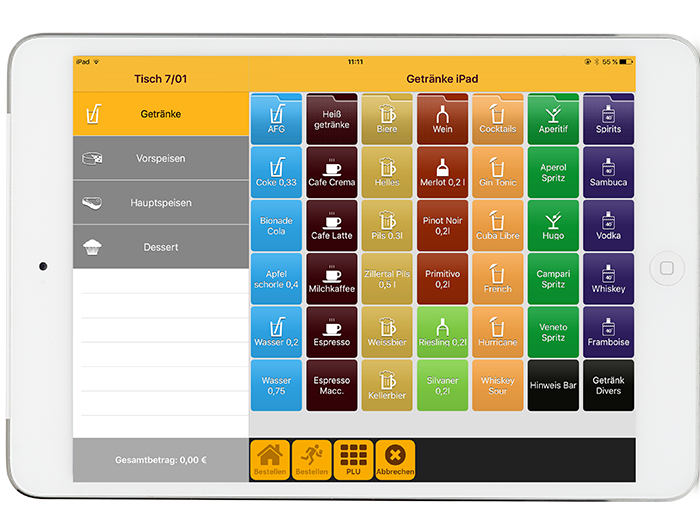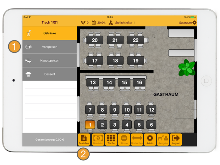 Om een bestelling te plaatsen kiest u allereerst in de tafelplattegrond de tafel waarop u uw producten wilt boeken. Vervolgens heeft u twee mogelijkheden om het bestelscherm te openen.