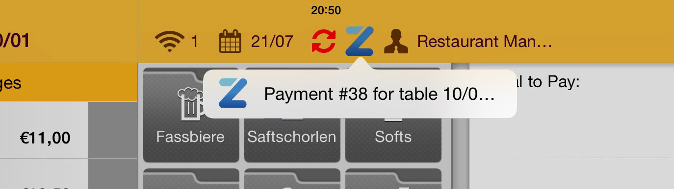 Het informatiescherm bovenaan in uw iPad kassasysteem zal daarnaast een “Z” icoon tonen om te bevestigen dat er Zapper betalingen zijn ontvangen.