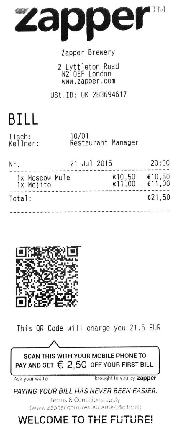 Wanneer uw gast niet op de hoogte is van Zapper betalingen en bijvoorbeeld contant wou betalen, bevat de contantrekening een Zapper QR-Code (offline aangemaakt) en de promotionele afbeelding.
