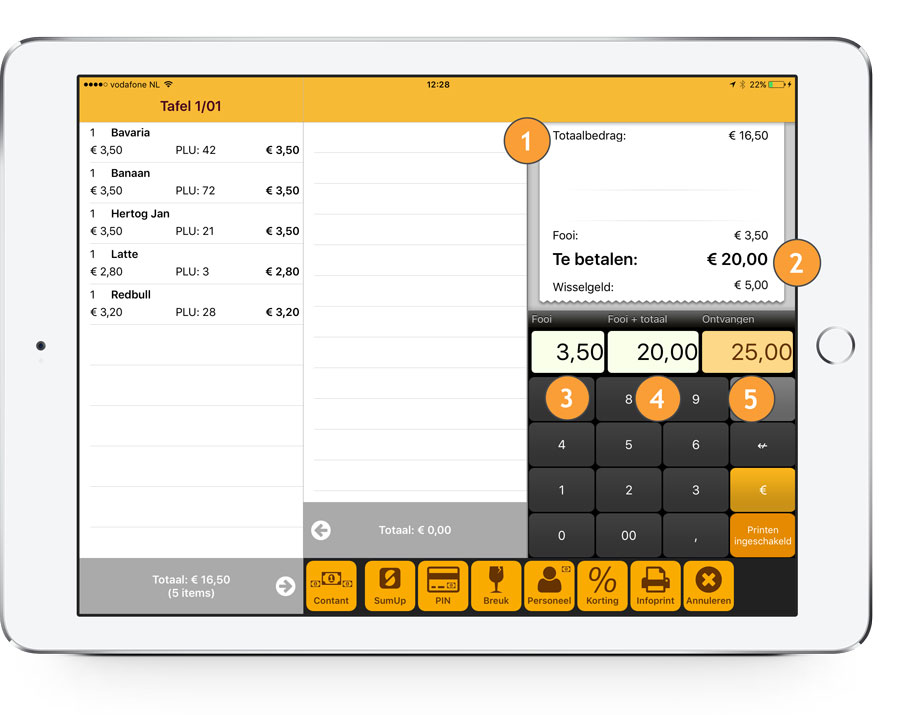 Bij het afrekenen kunt u erg eenvoudig fooien opboeken met behulp van het "Fooi" veld.