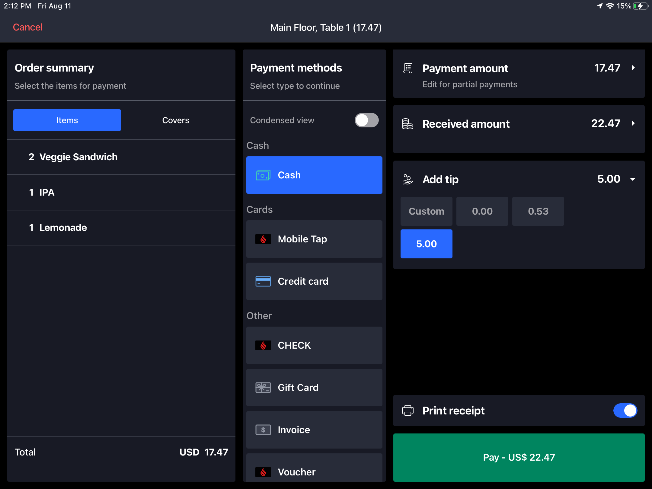 - Selecteer de betaalmethode en het ontvangen bedrag. Als je klant een fooi heeft toegevoegd, kun je die hier invoeren.