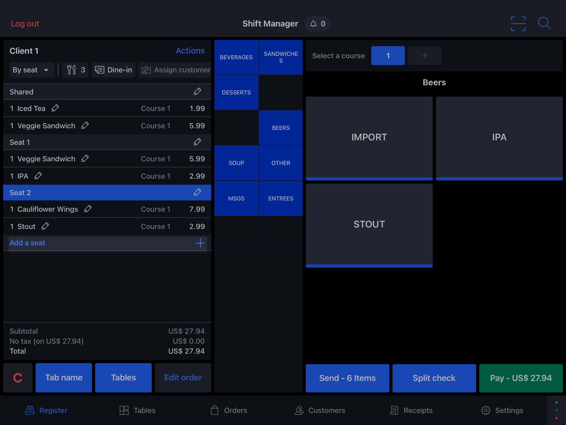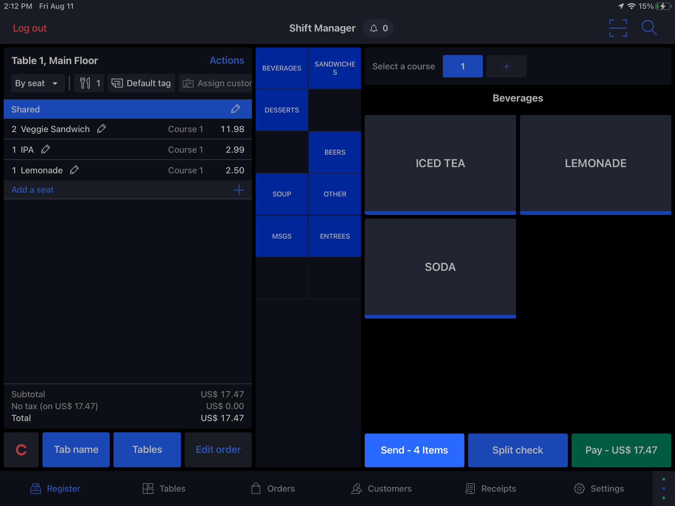 - Tik op Verzenden om de items van de bestelling naar de keuken te sturen. De bestelling wordt in de wacht gezet en als een openstaande bestelling beschouwd totdat deze wordt afgesloten.