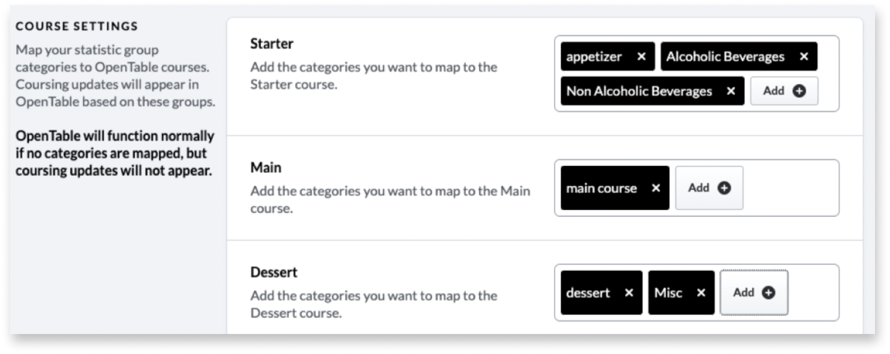 - - Vul de velden Categorie en Waarde in, waarbij Waarde overeenkomt met de statistische categorie die je aan de OpenTable-statistieken wilt toewijzen. De omzetgroep 'Alcoholische dranken' kan bijvoorbeeld de statistische categorie 'Dranken' hebben.