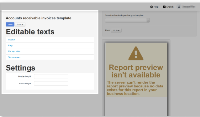 - Breng je wijzigingen aan voor je sjabloon onder Bewerkbare teksten in de gerelateerde tabbladen Factuur, Pagina, Kassabon van tafel en Btw-overzicht en/of onder Instellingen.