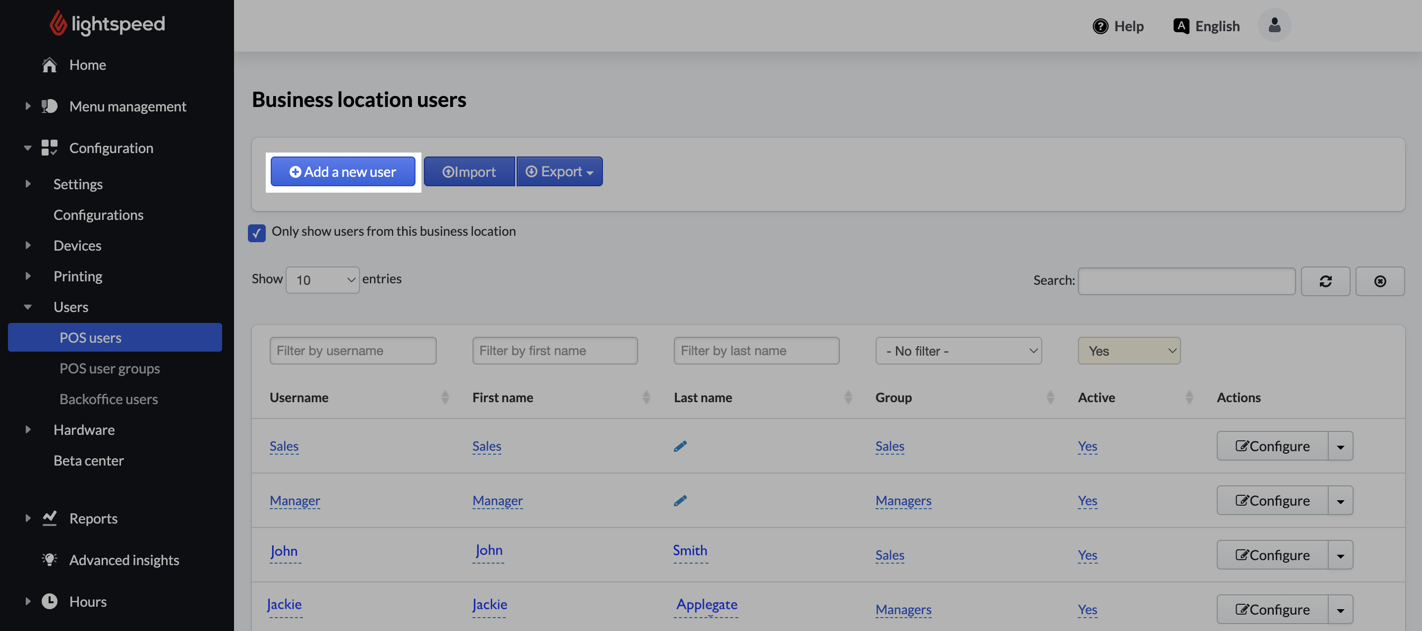 - Selecteer in het navigatiemenu Configuratie > Gebruikers > POS-gebruikers.