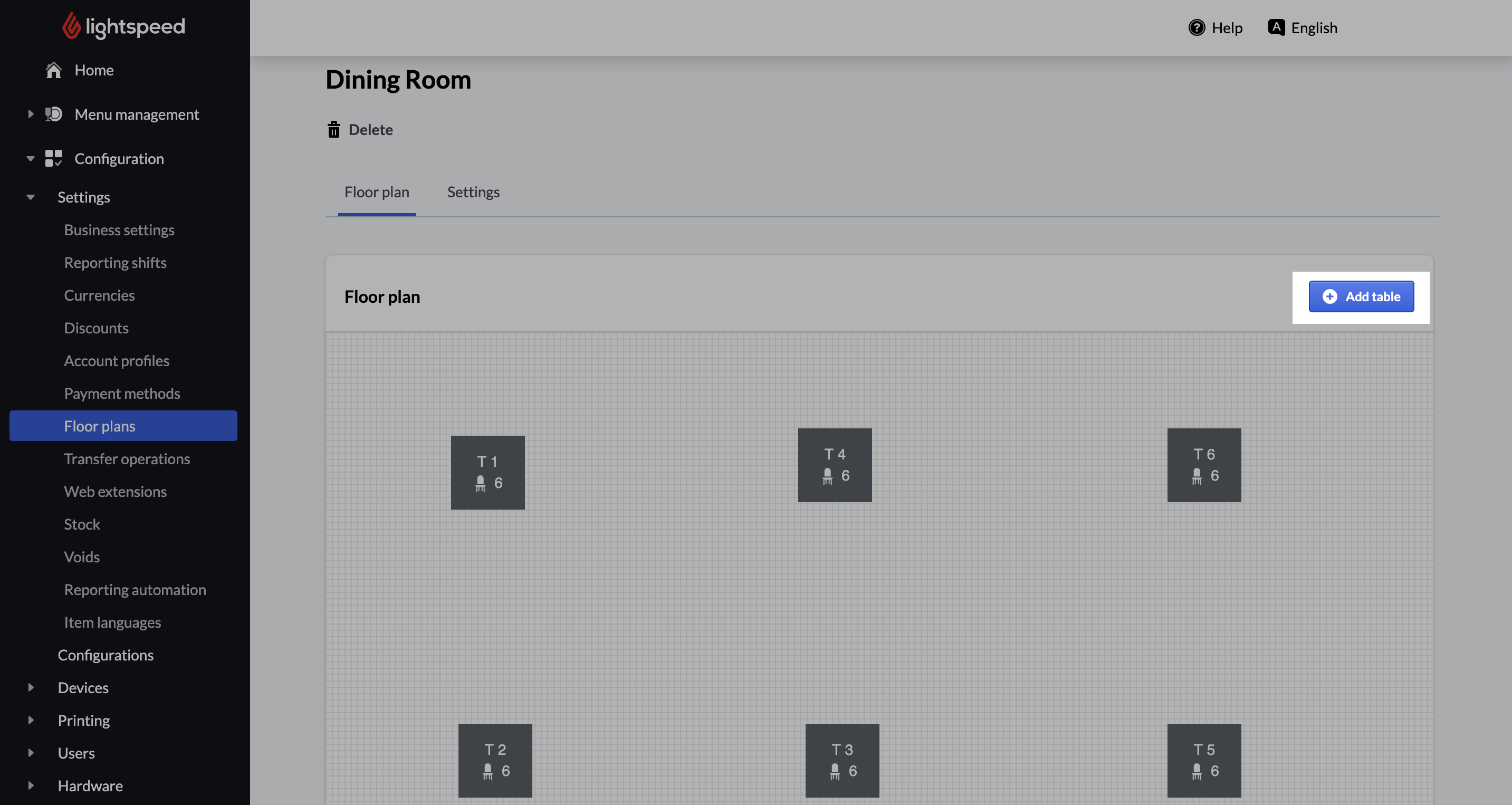 - (Optioneel) Klik op het tabblad Instellingen en configureer de vloerplan- en printerinstellingen, zoals de weergavenaam van de tafel en het printprofiel van de bon.