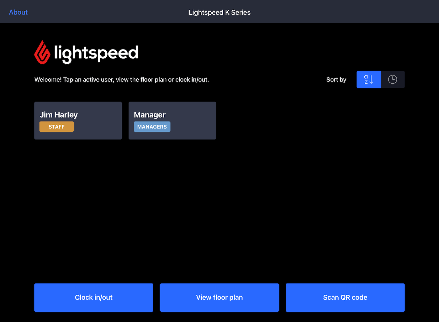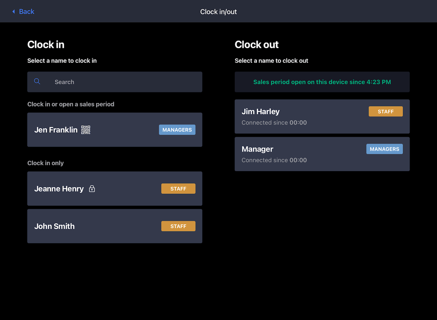Afhankelijk van de instellingen van gebruikers kunnen ze simpelweg op hun naam tikken, op hun naam tikken en een pincode invoeren of een QR-code scannen om in te klokken of uit te klokken.