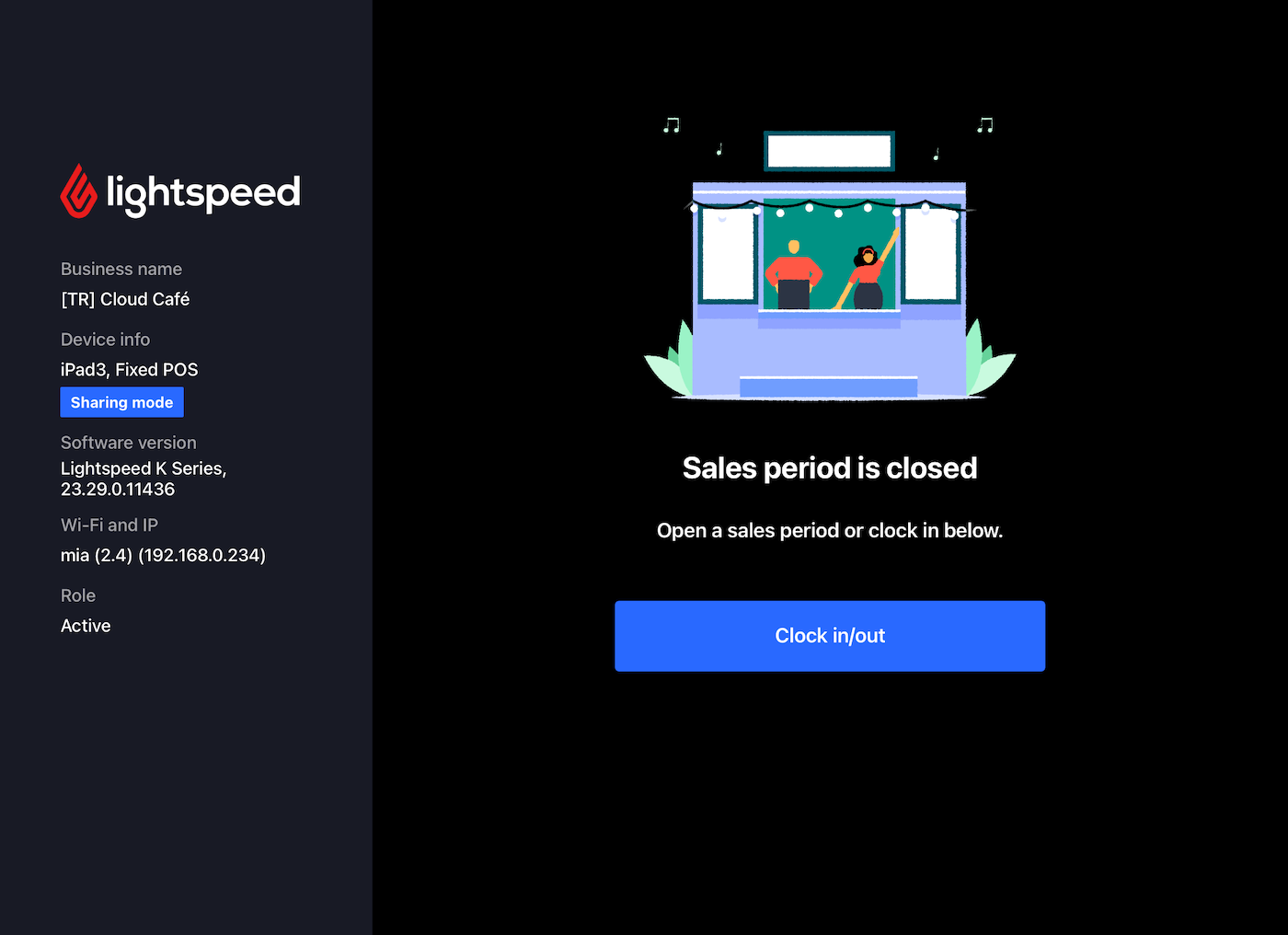 Bij een gesloten verkoopperiode zijn de enige opties in- of uitklokken en een verkoopperiode openen.
