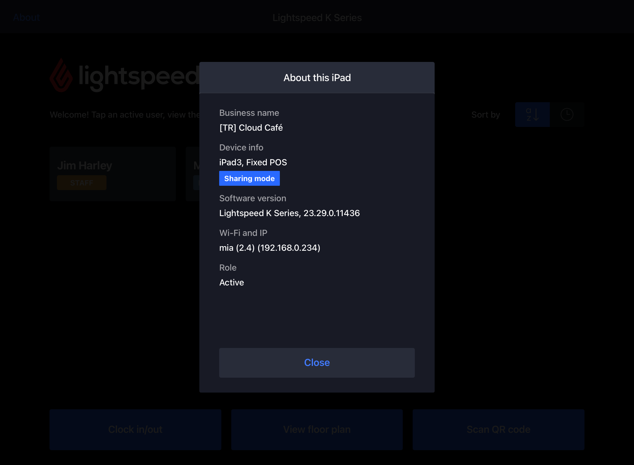 Controleer de naam van je POS-apparaat, de versie van Lightspeed Restaurant op dat apparaat, het IP-adres en andere gerelateerde informatie aan de rechterzijde van het Home-scherm.