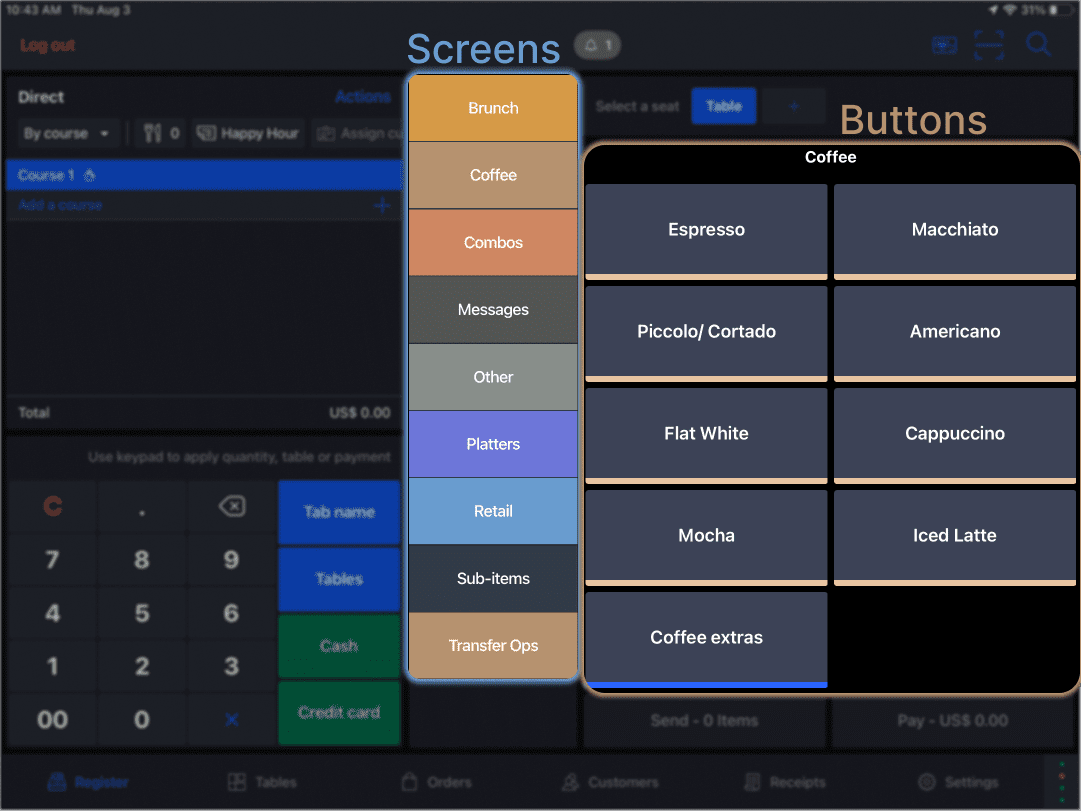 Als je bijvoorbeeld een scherm met de naam "Brunch" hebt ingesteld, verschijnt er een lijst met knoppen die overeenkomen met de menu-items die je aan de backoffice hebt toegevoegd, zoals Toast met avocado, Eggs benedict, enzovoort.
