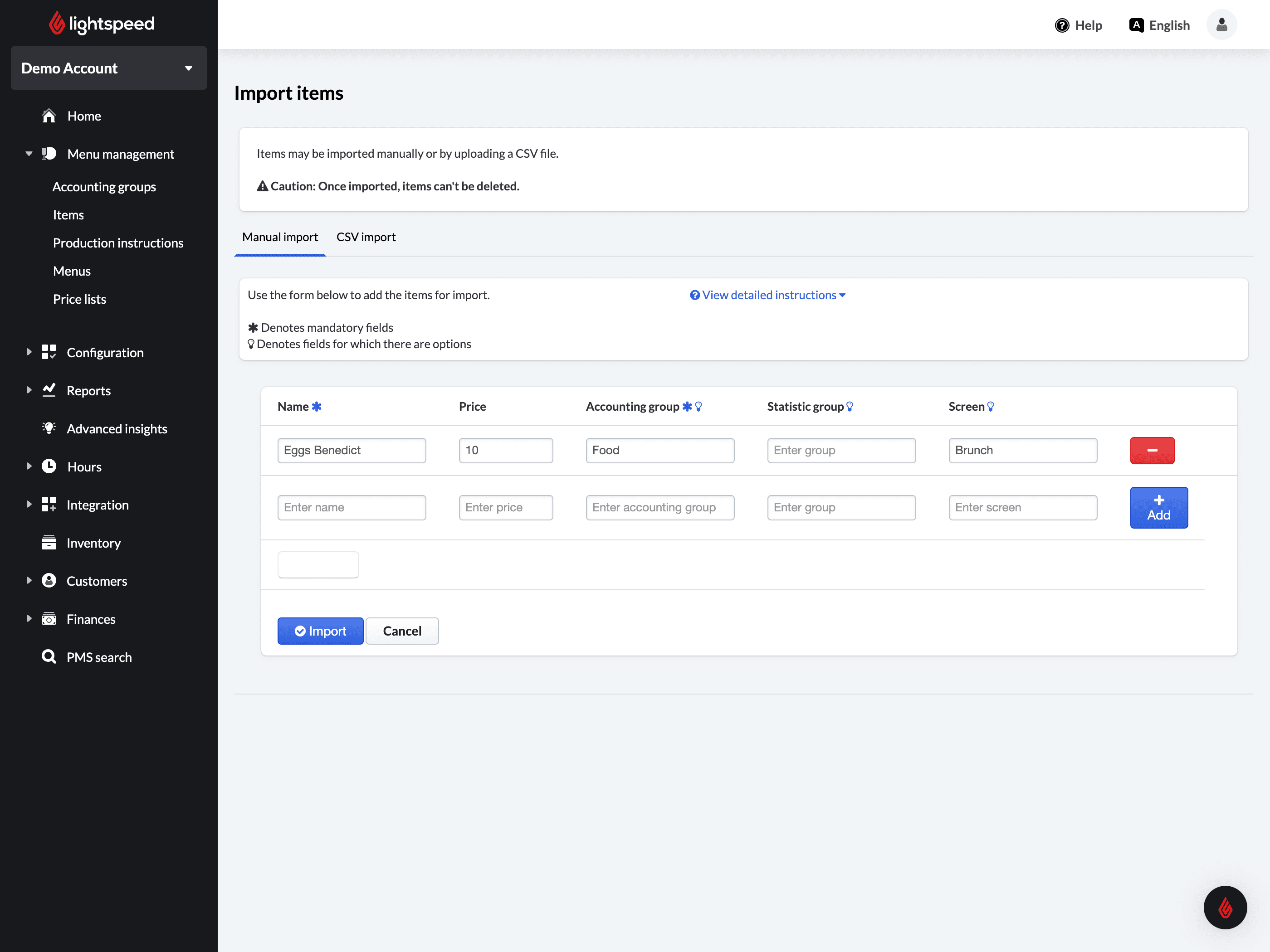 De snelste manier om meerdere items aan je backoffice toe te voegen is via de optie Handmatig importeren, waar je basisinformatie over je items invoert.