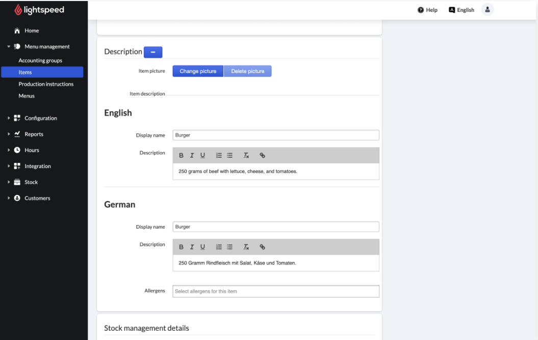 Je kunt een gedetailleerde beschrijving toevoegen aan een item dat aan de gebruiker op de POS wordt getoond. De beschrijving komt in beeld als je het item een paar seconden aanraakt en vasthoudt. De klant kan het nuttig vinden om meer te weten over het item, zoals uit welke ingrediƫnten een gerecht bestaat of wat achtergrondinformatie over een bepaalde wijn. Vanuit de backoffice kun je de talen instellen die worden gebruikt voor het invoeren van beschrijvingen.