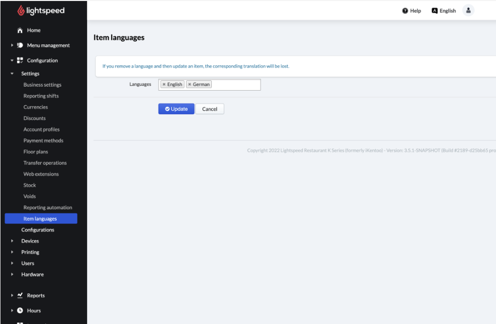 - Selecteer in het hoofdnavigatiemenu Configuratie > Instellingen > Talen van items.