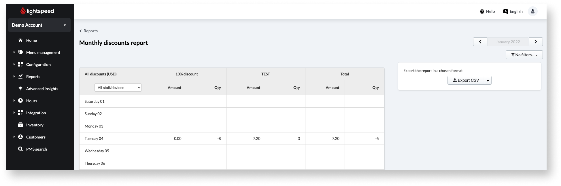 In het rapport "Maandelijkse kortingen" staat een kort overzicht van de kortingen die in de loop van die maand zijn gegeven. Met dit rapport kun je in één oogopslag de kortingen beoordelen die op een bepaalde dag zijn afgegeven en hun waarde zien.