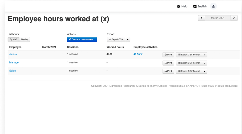 De sectie Uren van de backoffice geeft een overzicht van alle gebruikersshiften die zijn in- en uitgelogd op de POS. Naast een overzicht kun je ook handmatig gebruikersshiften toevoegen via de pagina's Uren per maand en Nieuwe sessie. Vanuit de sectie Uren kun je gerapporteerde shiften exporteren, opslaan en printen, zodat je altijd toegang hebt tot deze gegevens buiten de backoffice.