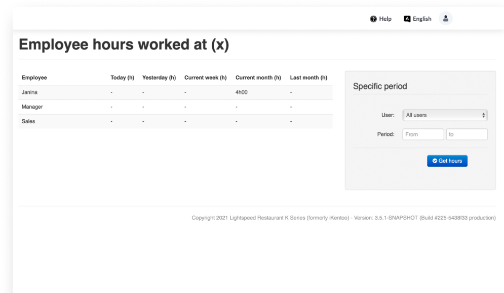 De pagina Overzicht geeft een overzicht van alle gebruikersshiften op de POS. Je bereikt de pagina Overzicht door in het hoofdnavigatiemenu van de backoffice te kiezen voor Uren > Overzicht. Op deze pagina kun je de shiften van werknemers voor bepaalde verkoopperioden bekijken. Filter op gebruiker en/of verkoopperiode met het veld Specifieke periode.