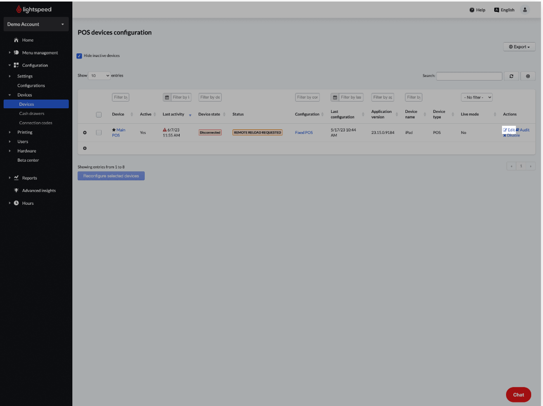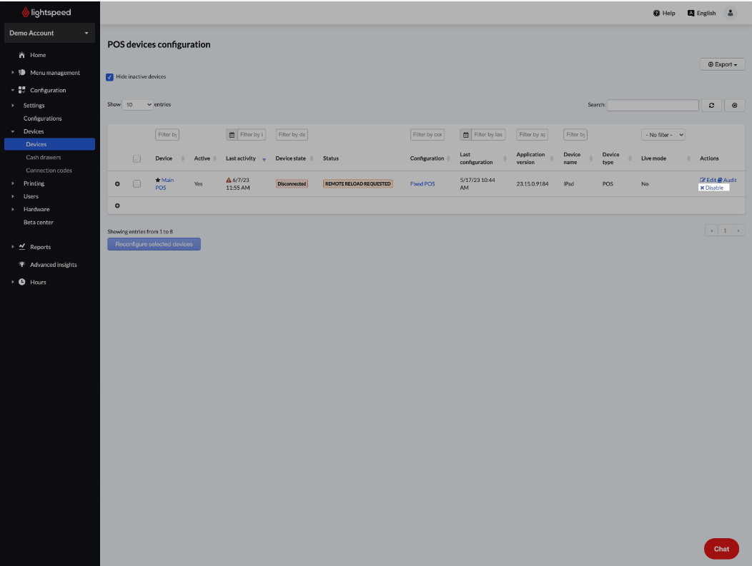 Als je ooit een POS-apparaat uit je systeem moet verwijderen, kun je het uitschakelen via de configuratietabel voor POS-apparaten. Dit zal het POS-apparaat niet permanent verwijderen, maar gedeactiveerde apparaten zijn niet meer zichtbaar op deze pagina als je "Inactieve apparaten verbergen" selecteert. OPMERKING: Als je een apparaat deactiveert, verwijder je ook de connectiecode.