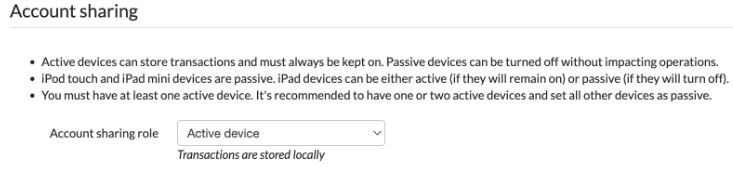 Met de rol bij het delen van de rekening kun je specificeren of een POS-apparaat een actief of passief apparaat moet zijn. Je kunt de volgende rollen toewijzen: