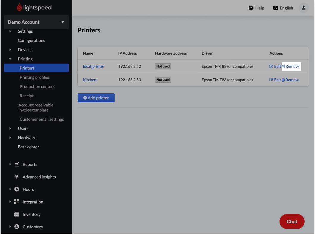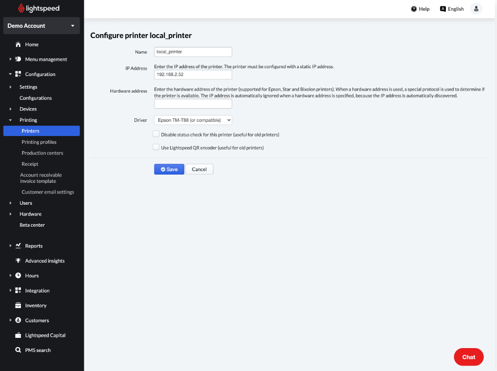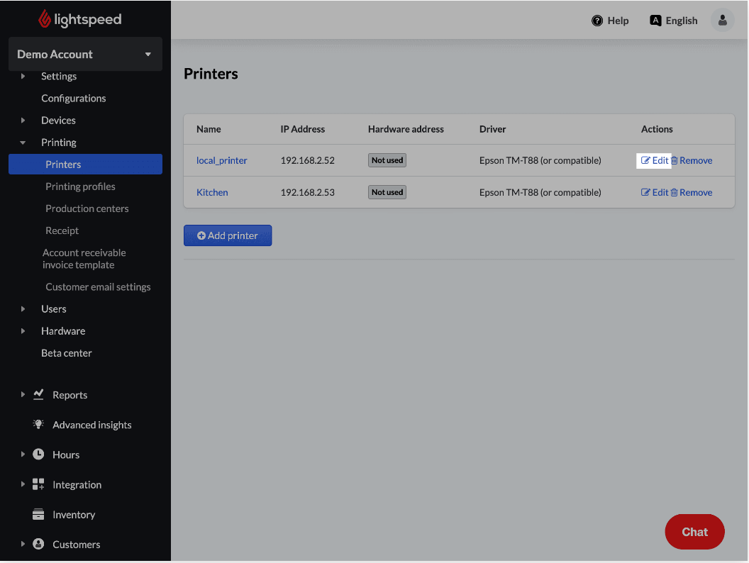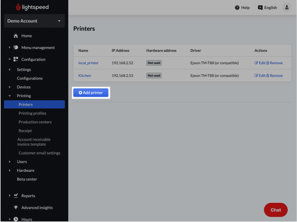 Printers zijn de hardware die wordt gebruikt om documenten zoals kassabonnen of keukenbonnen van Lightspeed Restaurant af te drukken. Om printers met Lightspeed Restaurant te gebruiken, moet je printerinstellingen configureren vanuit de backoffice.