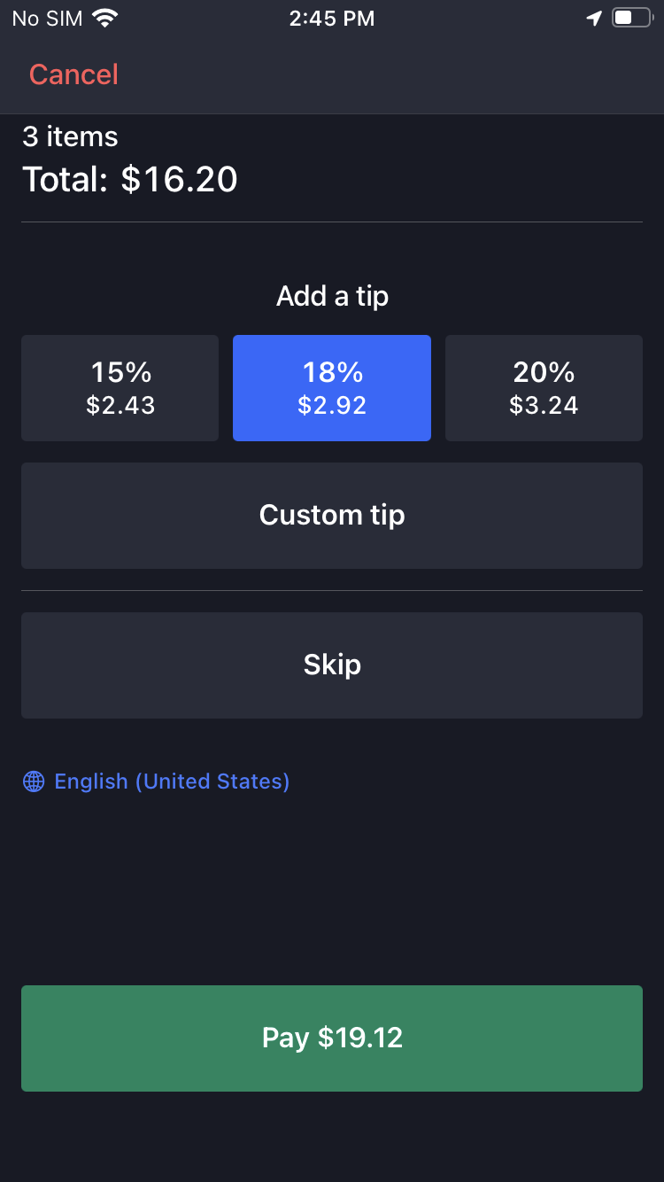 Opmerking: bij de eerste Tap to Pay-transactie die je via Lightspeed Payments verwerkt, wordt je gevraagd om Tap to Pay voor iPhone aan je Apple ID te koppelen. - Als fooien zijn geactiveerd, wordt de klant via een melding op het scherm gevraagd om een fooi te selecteren.