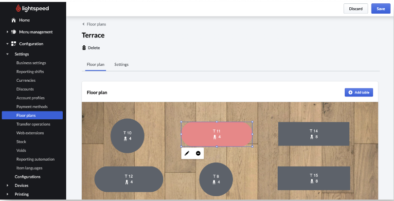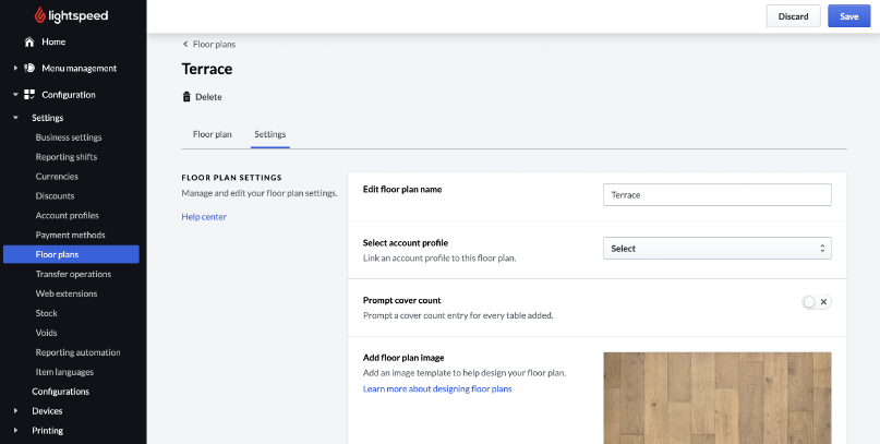 Bewerk vloerplannen om de naam van het vloerplan, het rekeningprofiel, het couvertaantal, de afbeelding en de printprofielen te wijzigen. Verwijder een vloerplan om deze volledig uit Lightspeed te verwijderen.