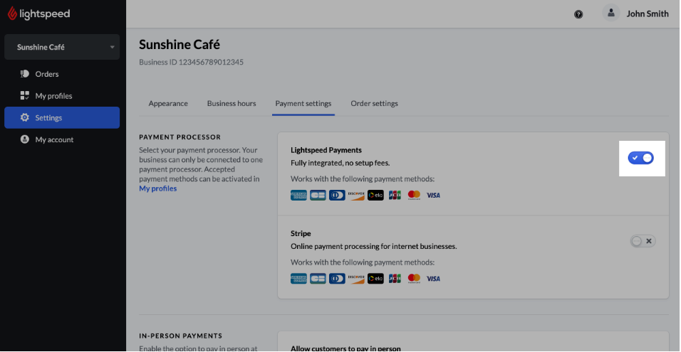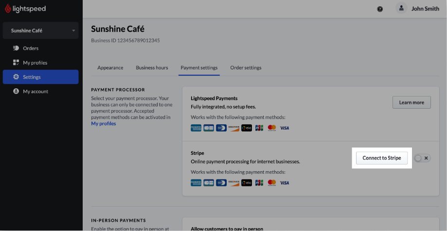 Online betalingen worden verwerkt door Lightspeed Payments of een derde partij door middel van Stripe afhankelijk van uw instellingen in het Order Anywhere-backoffice.