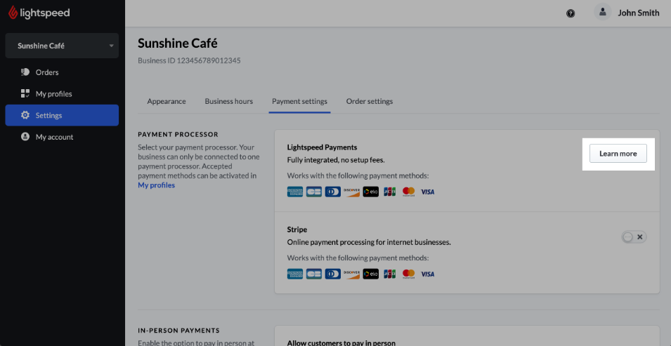 Schakel online en/of betalen in het restaurant in om klanten de mogelijkheid te bieden om voor hun bestellingen te betalen via Order Anywhere. Online betalen stelt klanten in staat om met hun mobiele apparaat, tablet of computer te betalen met gebruik van een creditcard of betaalpas (Lightspeed Payments of Stripe), of door middel van Apple Pay, Google Pay, Bancontact, Payconiq of iDEAL (alleen voor Lightspeed Payments). Met betalen in het restaurant kunnen klanten betalen op het verkooppunt wanneer zij hun bestelling ophalen, of na het dineren in het restaurant.