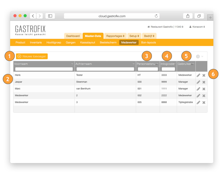U kunt in de GASTROFIX Cloud nieuwe kassagebruikers toevoegen. Ga hiervoor naar "Master Data > Medewerkers". In de laatste lege regel typt u de voor- en achternaam van de medewerker in, geeft u een personeelsnummer op (dit is enkel een intern nummer) ...
