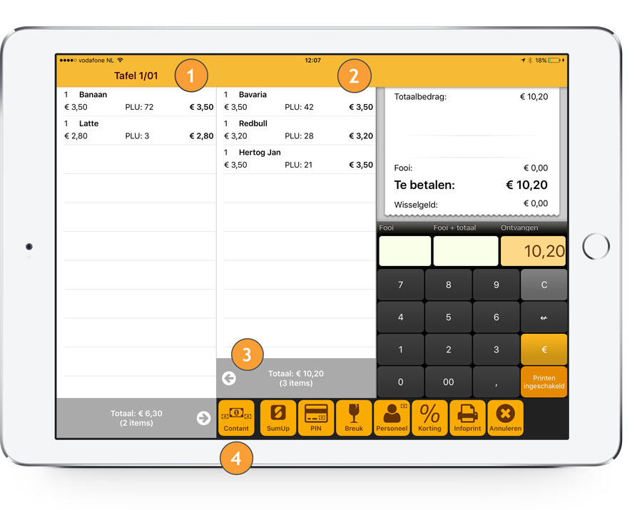 Om een tafel af te rekenen klikt u op de betreffende tafel en kiest u voor de optie "afrekenen". De bestelling rekent u eenvoudig af door onder in het afrekenscherm de betaalmethode te selecteren.