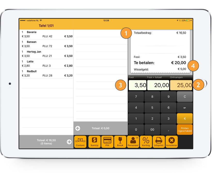 Hier ziet u het te betalen bedrag, inclusief fooi, alsook het wisselgeld.